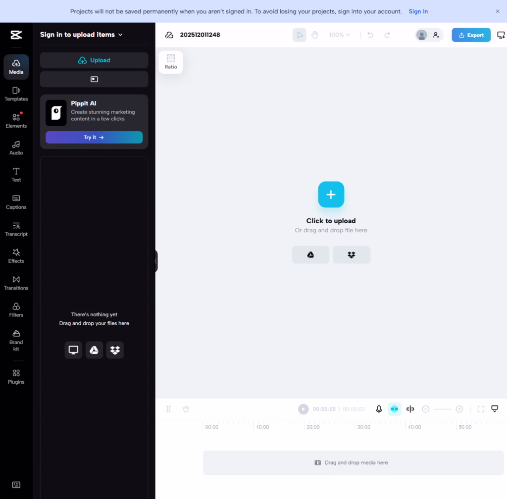 Интерфейс CapCut похож на Canva, но без шаблонов на старте. Здесь видишь только свои файлы, никаких чужих проектов нет. Для начала работы достаточно загрузить видео на платформу один раз. Сервис работает на компьютере или в приложении для телефона.