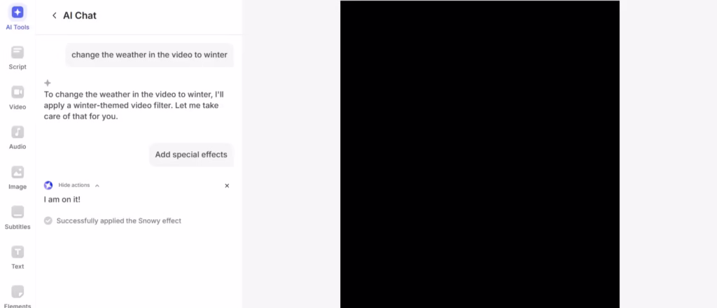 На рабочем экране – классика жанра: есть таймлайн видео, окно чата и несколько пресетов того, что можно изменить. Пресеты достаточно скромные, больше подходят для тех, кто создаёт UGC контент, но нас интересует другое. Я копирую промт, который использовал раньше, и запускаю процесс обработки.
